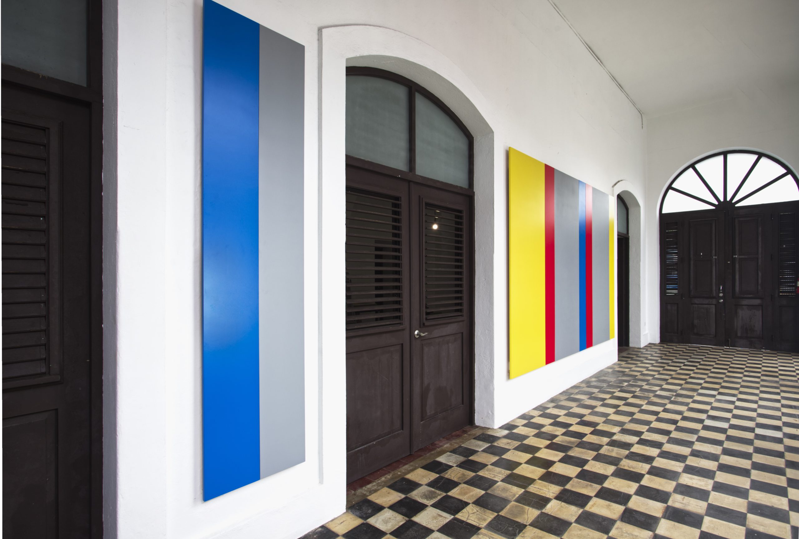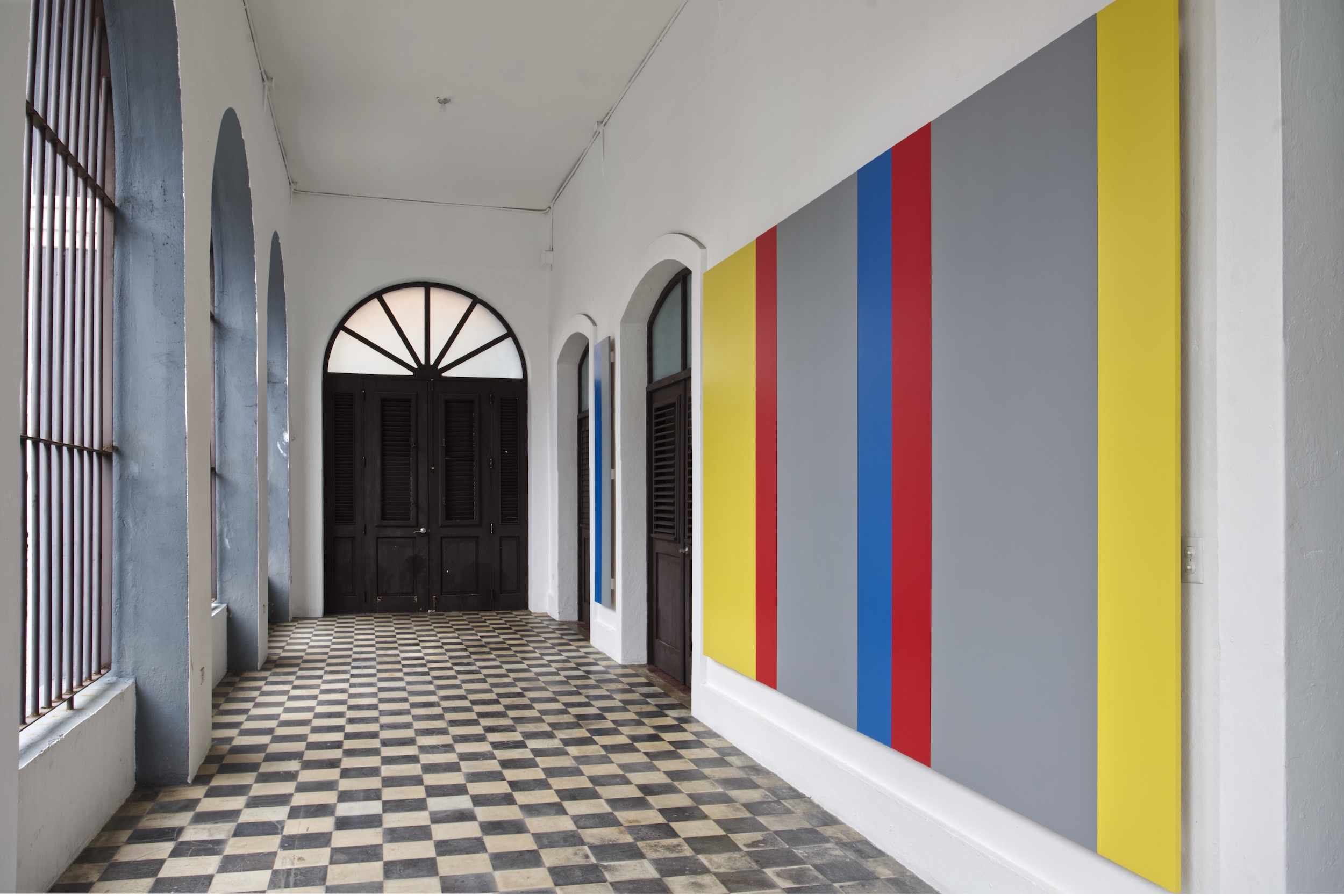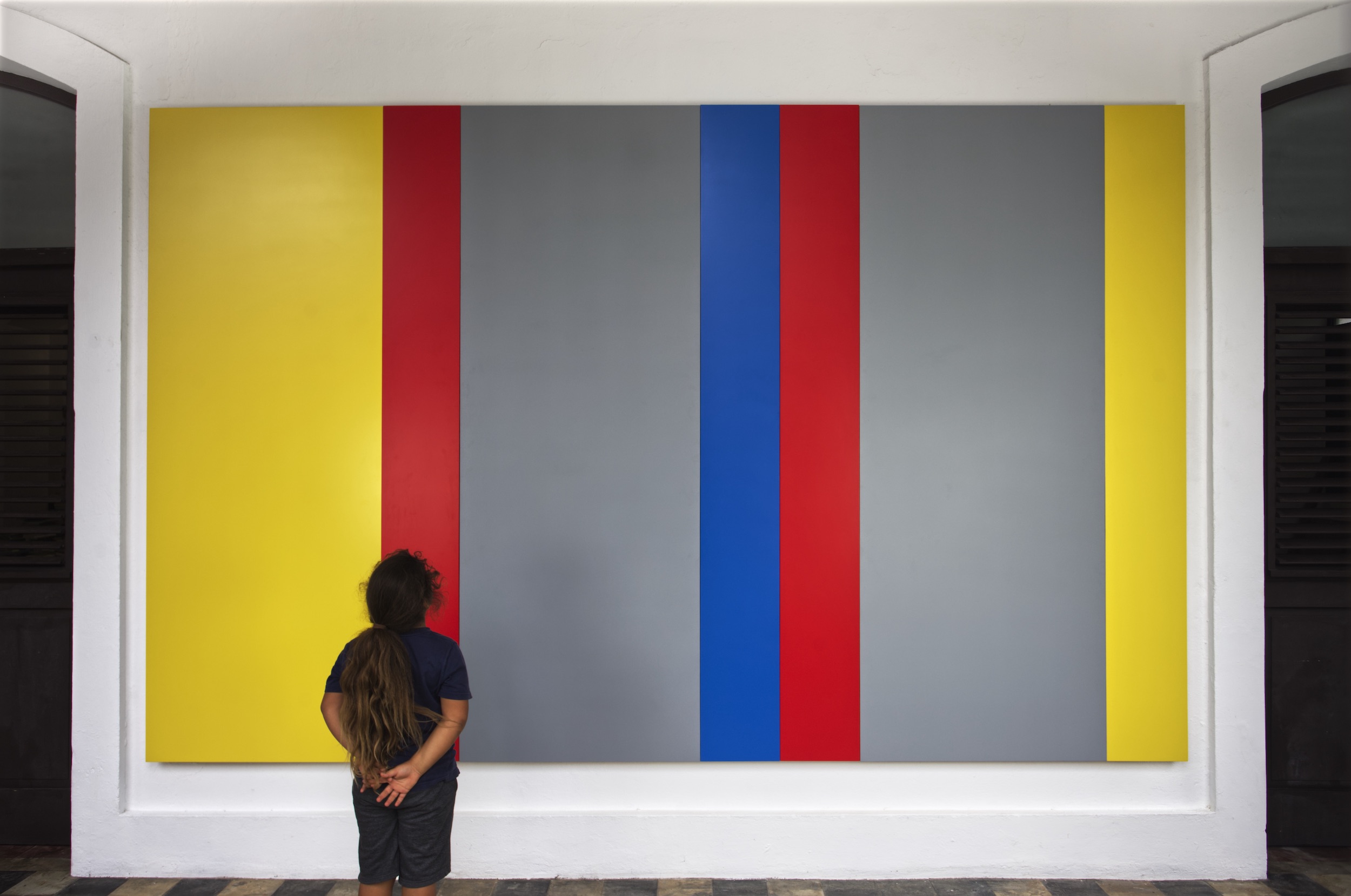 Esta pintura está compuesta por 9 paneles pintados en una paleta de colores primarios y organizados de manera rítmica logrando una composición geométrica de gran escala. Una vez terminado el tiempo de exhibición de esta pintura los 9 paneles que la componen pasarán a ser las superficies de tres mesas y seis bancos que servirán como el nuevo soporte de nuestro quehacer diario.